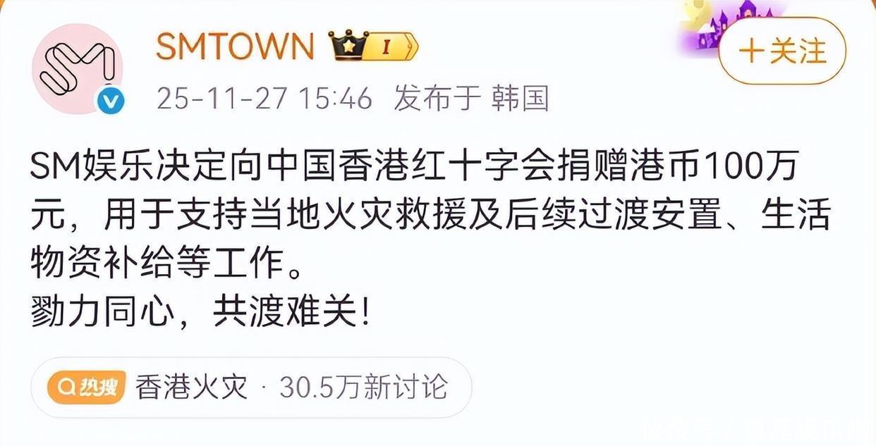 更令人感慨的是,这份善意甚至跨越了国界。原定于本周末在香港举行的MAMA音乐盛典虽照常举办,但主办方主动取消红毯、火焰特效,并增设默哀环节。SM娱乐、YG娱乐等韩娱巨头纷纷捐款,旗下aespa、RIIZE、(G)I-DLE等当红团体也慷慨解囊,金额万万不等。连本应出席盛典的周润发、杨紫琼也主动退场,以示对逝者的尊重。