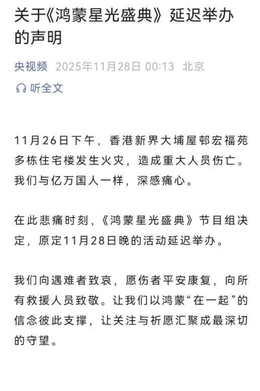 值得一提的是,原定近期举办的“鸿蒙星光盛典”——这场集结了易烊千玺、黄渤、刘欢、容祖儿、梁咏琪、任嘉伦等数十位顶流的央视大型晚会——也宣布延期。