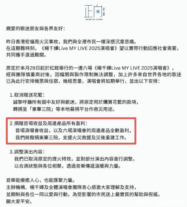 香港本地艺人同样没有缺席。杨千嬅原定日开启六场演唱会,面对灾难,她选择不取消演出——因为深知远道而来的歌迷已付出时间与金钱——但果断取消所有烟火特效,并承诺将首场全部收益及六场周边商品利润悉数捐出。这种既尊重观众又心系灾民的平衡之举,展现了成熟艺人的担当。