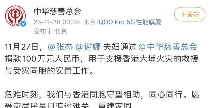 张杰与谢娜夫妇也以家庭名义向中华慈善总会捐赠同等金额。