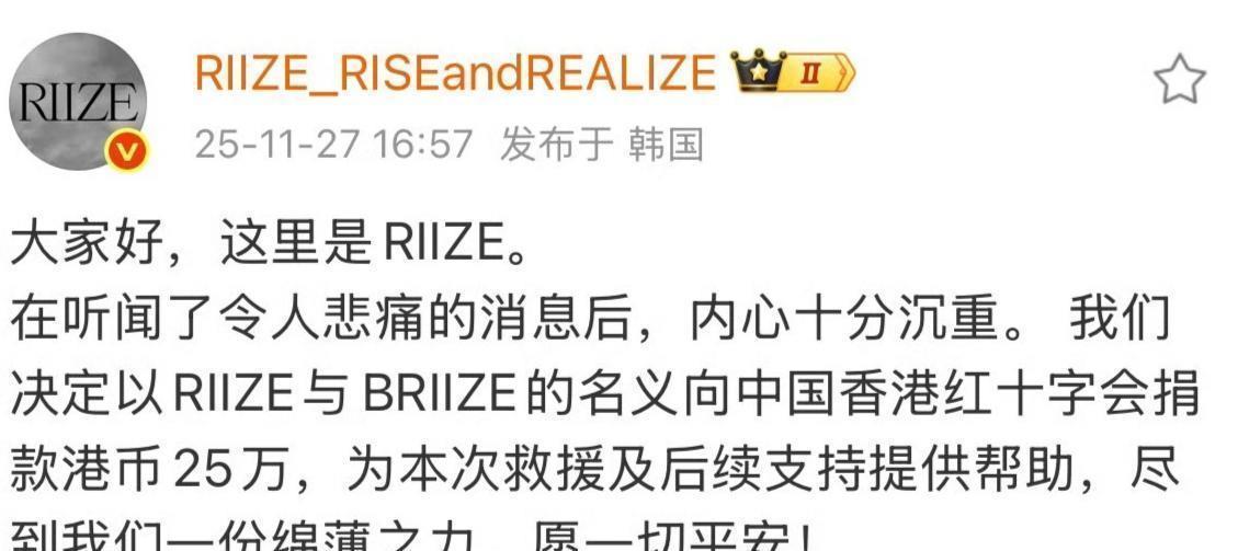 更令人感慨的是,这份善意甚至跨越了国界。原定于本周末在香港举行的MAMA音乐盛典虽照常举办,但主办方主动取消红毯、火焰特效,并增设默哀环节。SM娱乐、YG娱乐等韩娱巨头纷纷捐款,旗下aespa、RIIZE、(G)I-DLE等当红团体也慷慨解囊,金额万万不等。连本应出席盛典的周润发、杨紫琼也主动退场,以示对逝者的尊重。